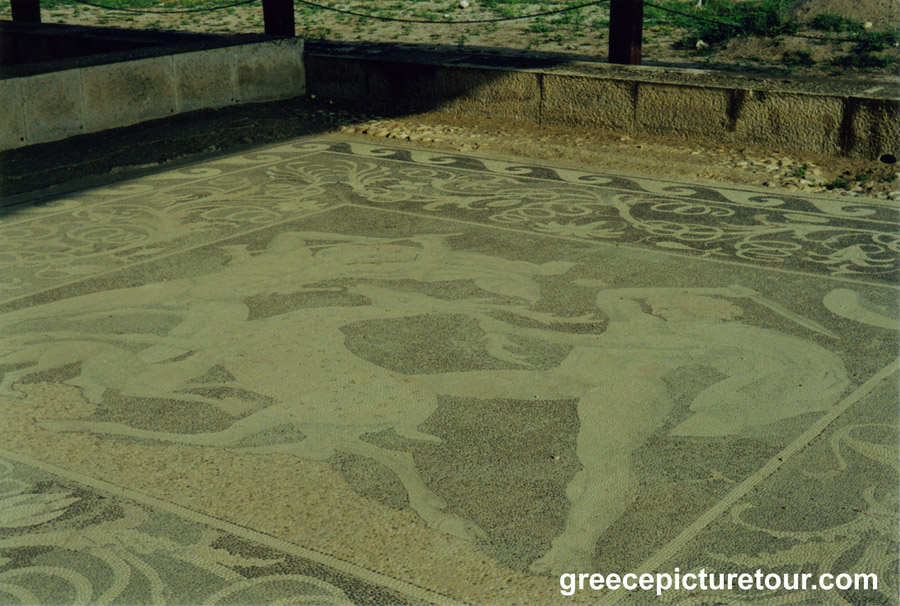 Under King Archelaus, the capital was moved to Pella. Here you can visit the ruins and the museum where you'll see beautiful and intricate pebble floor mosaics. Some are left outside in situ while others have been relocated into the museum. One of these can be seen in.